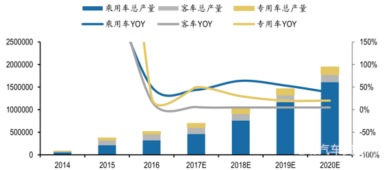 The future new energy passage vehicles are expected to benefit from the long-term mechanism of the Points System. Conservatively predicted, CAGR will reach 40% before 2020 comes. The peak time for the growth of new energy coaches has been over, its future production and marketing will remain relatively stable. But hopefully, the new energy special vehicle will benefit from the implementation of the Recommended Directory and the start of the replacement of cargo vans for power-driven vehicles, and enter the rapid growth period. The CAGR is expected to be near 30% before 2020 comes. Taken together, in the period from 2017 to 2020, the annual total output of new energy vehicles is conservatively predicted to be 700 thousand, 1.03 million, 1.47 million and 2.04 million vehicles with the CAGR reaching 40%. Benefiting from the increased sales volume of future new energy vehicles, the vehicle power battery demand of middle stream during the period from 2017 to 2020 is expected to reach 35GWh, 48GWh, 69GWh and 96GWh. Thanks to the ternary permeation among the passenger car, cargo van and coach, the ternary battery demand can hopefully reach 17GWh, 29GWh, 47GWh and 71GWh, faster than the overall growth rate of the battery industry.